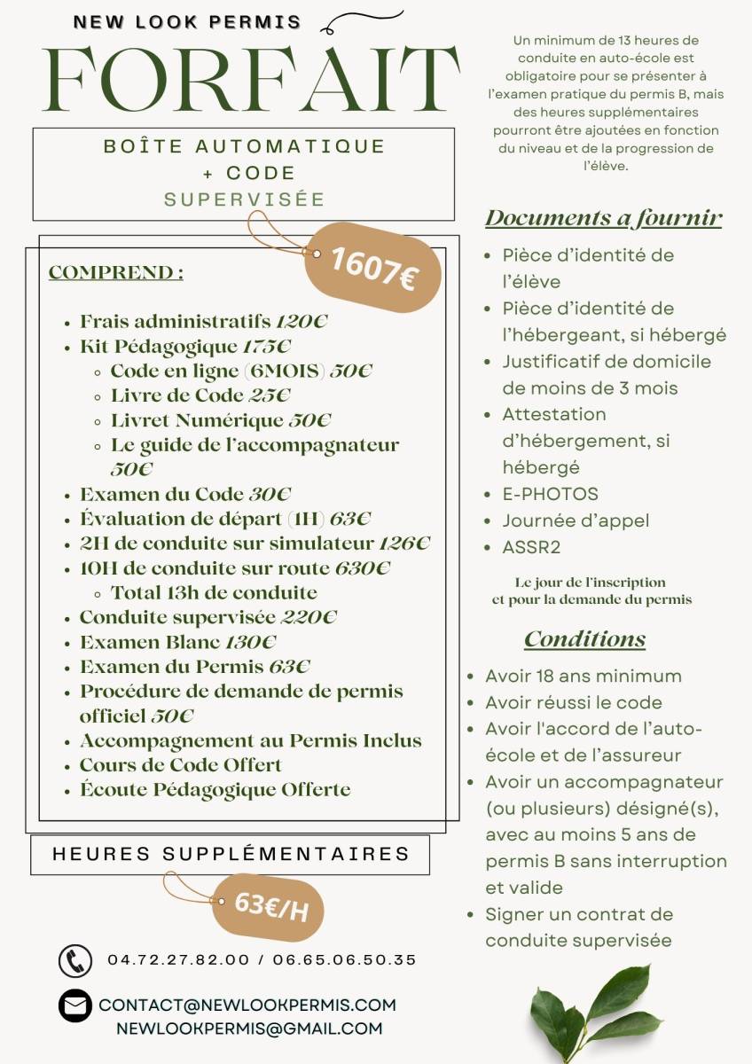 New Look Permis propose une formule complète en conduite supervisée, idéale pour les élèves souhaitant gagner en expérience de conduite en dehors de l’auto-école, après une formation initiale solide. Cette formule est adaptée à ceux qui débutent avec le code de la route inclus.